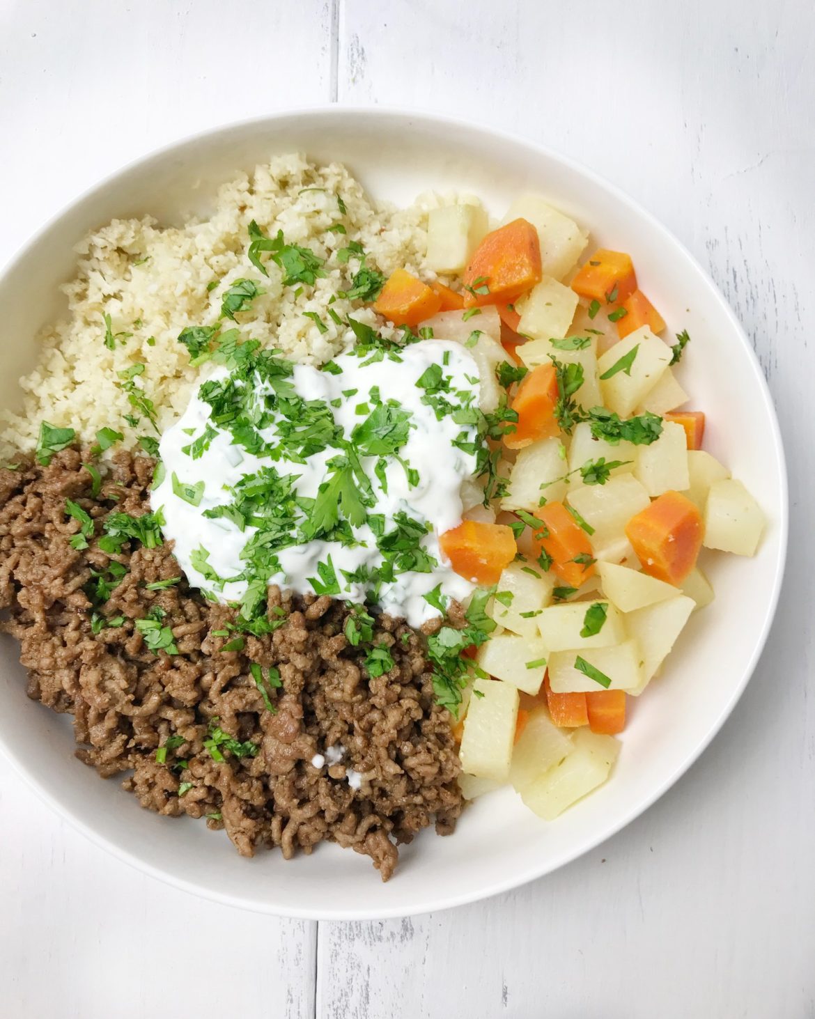 - Dann alles in einer Schüssel nebeneinander anrichten, oben drauf das Korianderjoghurt geben und mit dem restlichen frischen Koriander bestreuen.