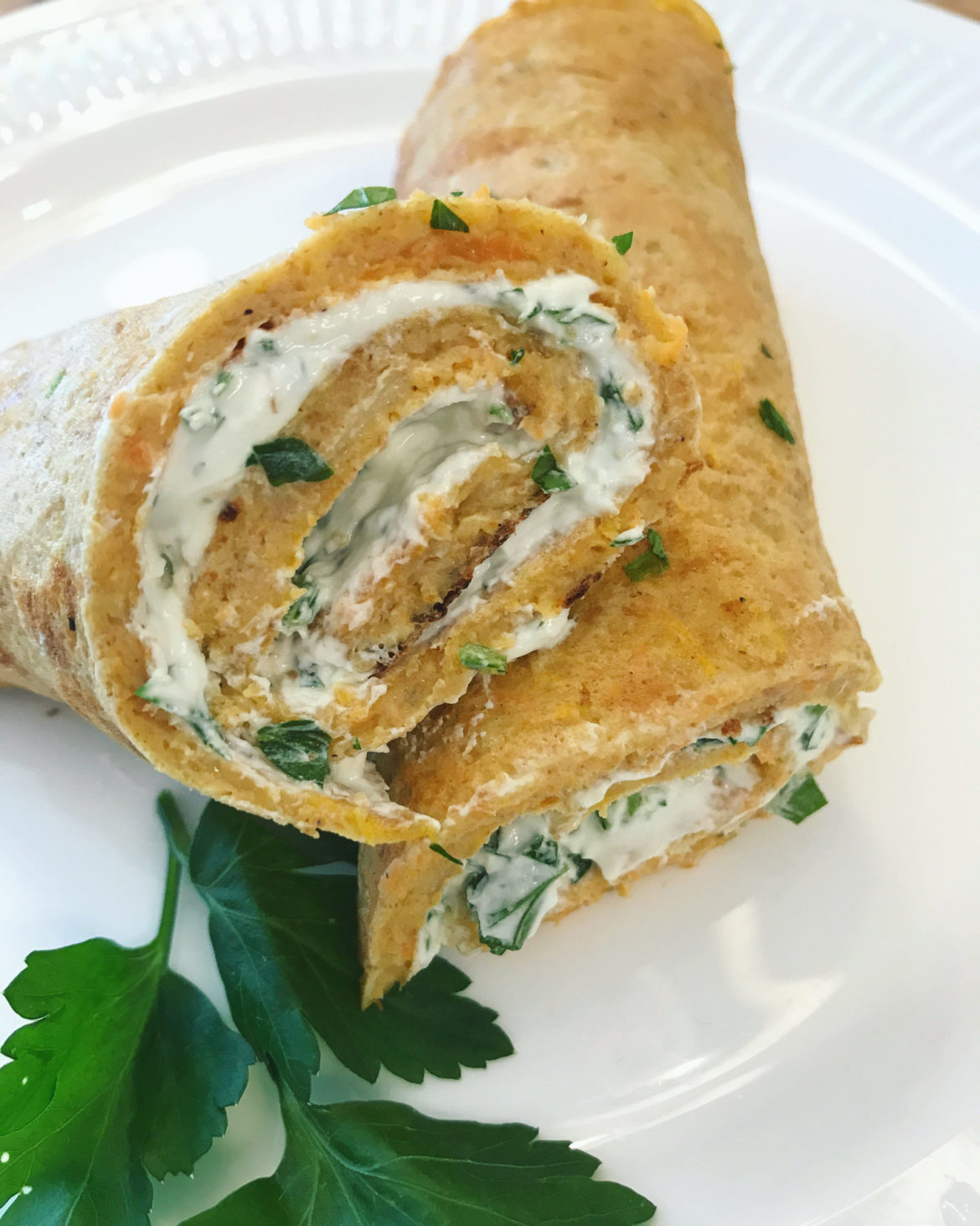 - Für die Füllung Petersilie (oder andere Kräuter) waschen und fein hacken. Anschließend Topfen mit Sauerrahm, Gewürzen, Zitronensaft und der gehackten Petersilie gut vermischen.
