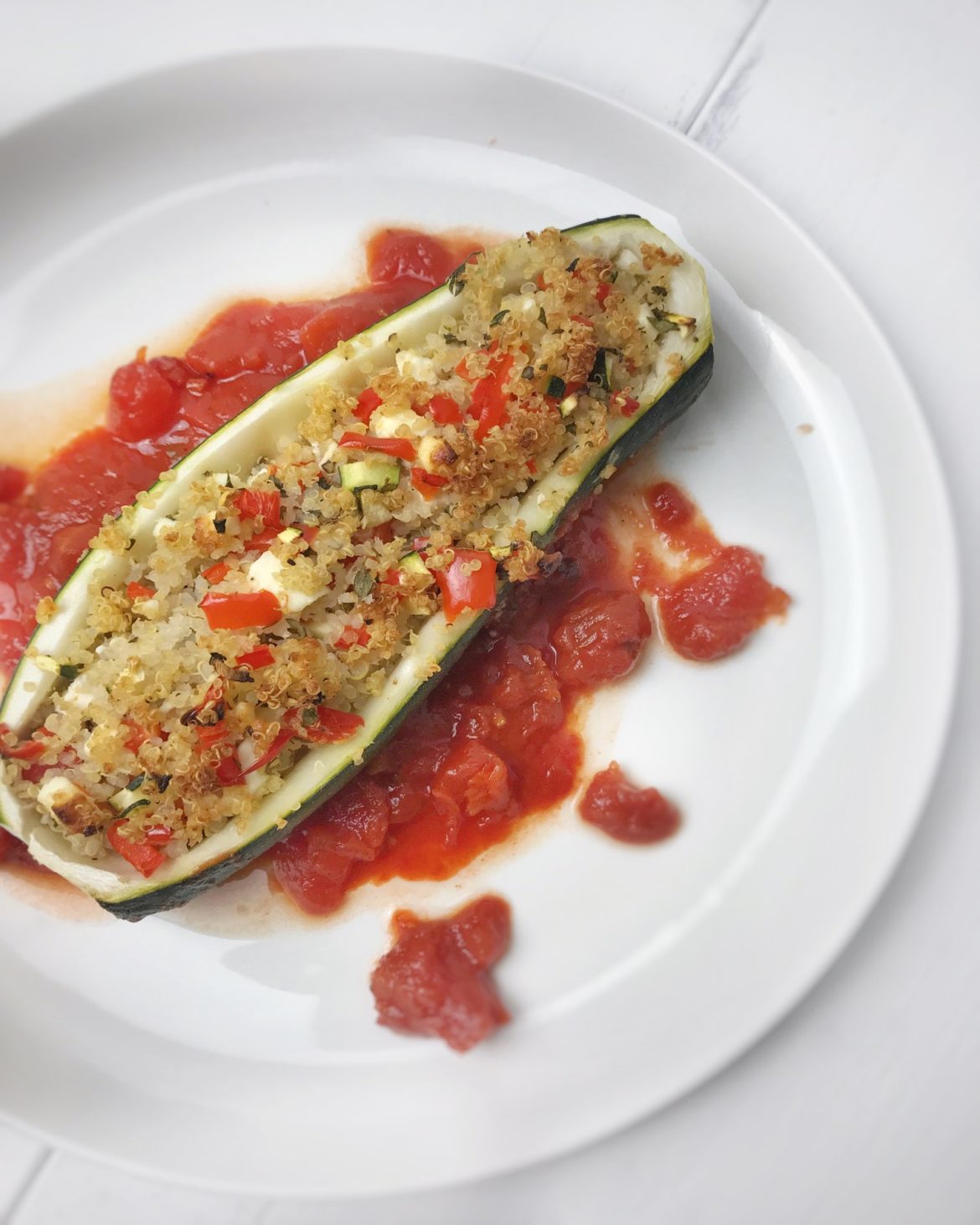 In diesem Fall mit Feta, Paprika und Quinoa (liebe ich ja anstelle von Reis). Schmeckt herrlich leicht und in Kombination mit der Tomatensoße ist es ein super Sommergericht.