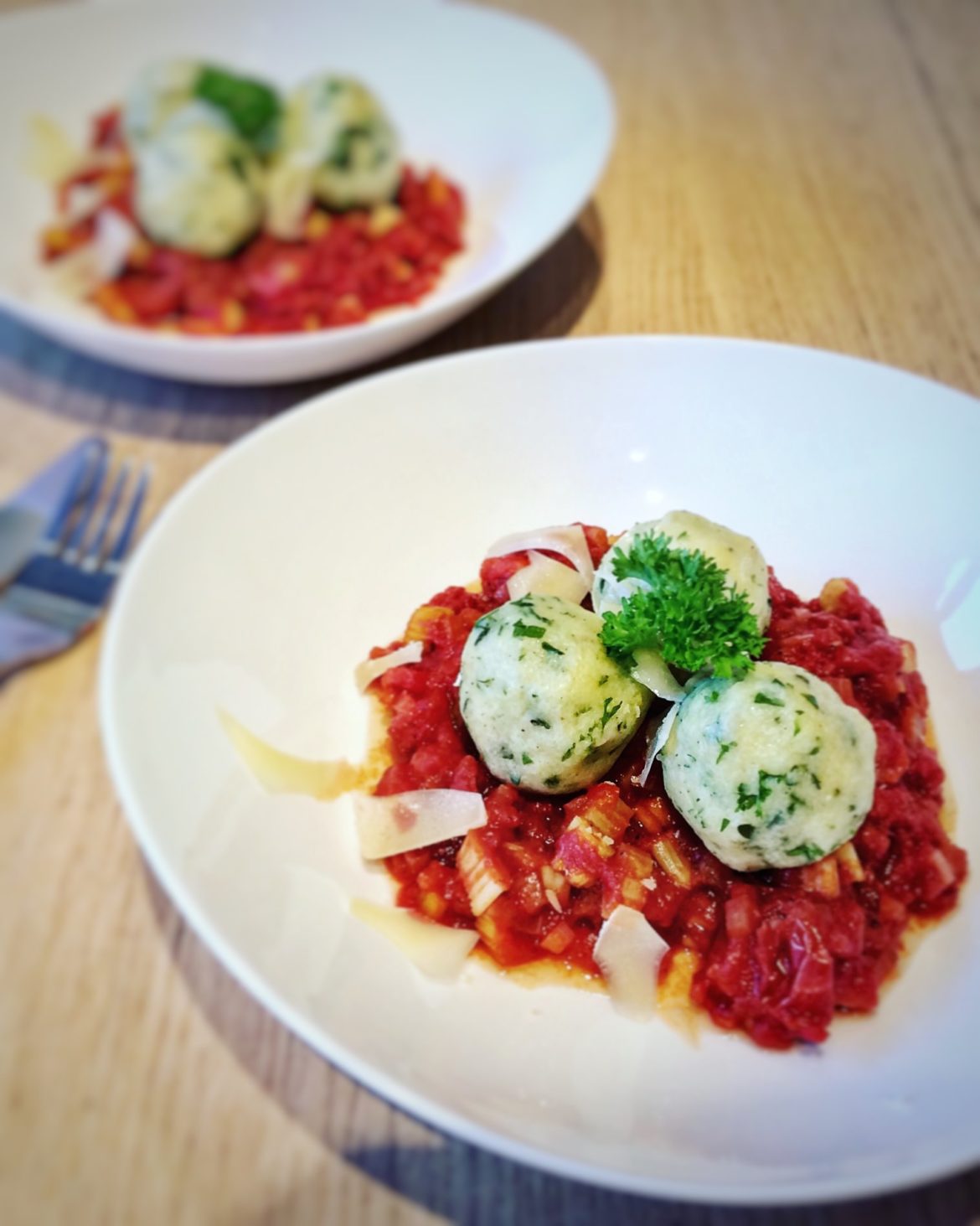 - In einem breiten Topf Salzwasser aufkochen. Währenddessen aus der Masse mit den Händen kleine Knödel formen.