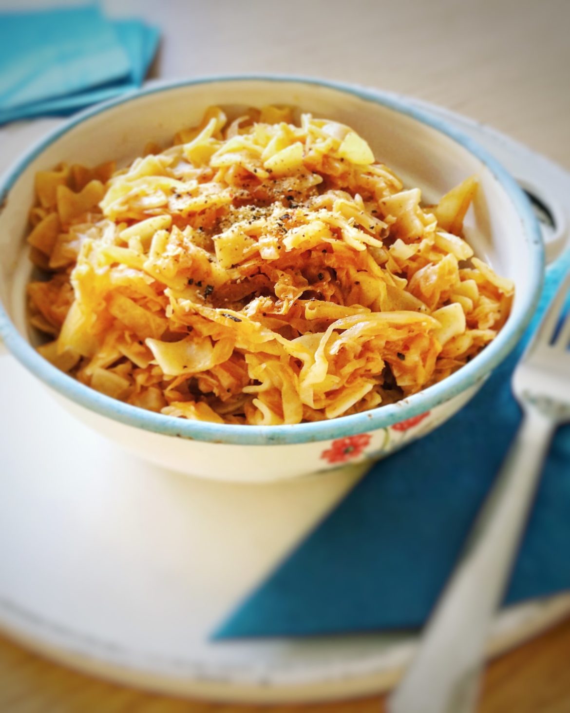 - Wenn das Kraut weich ist, die Fleckerl untermischen und mit Salz, Pfeffer und Chilipulver abschmecken.
