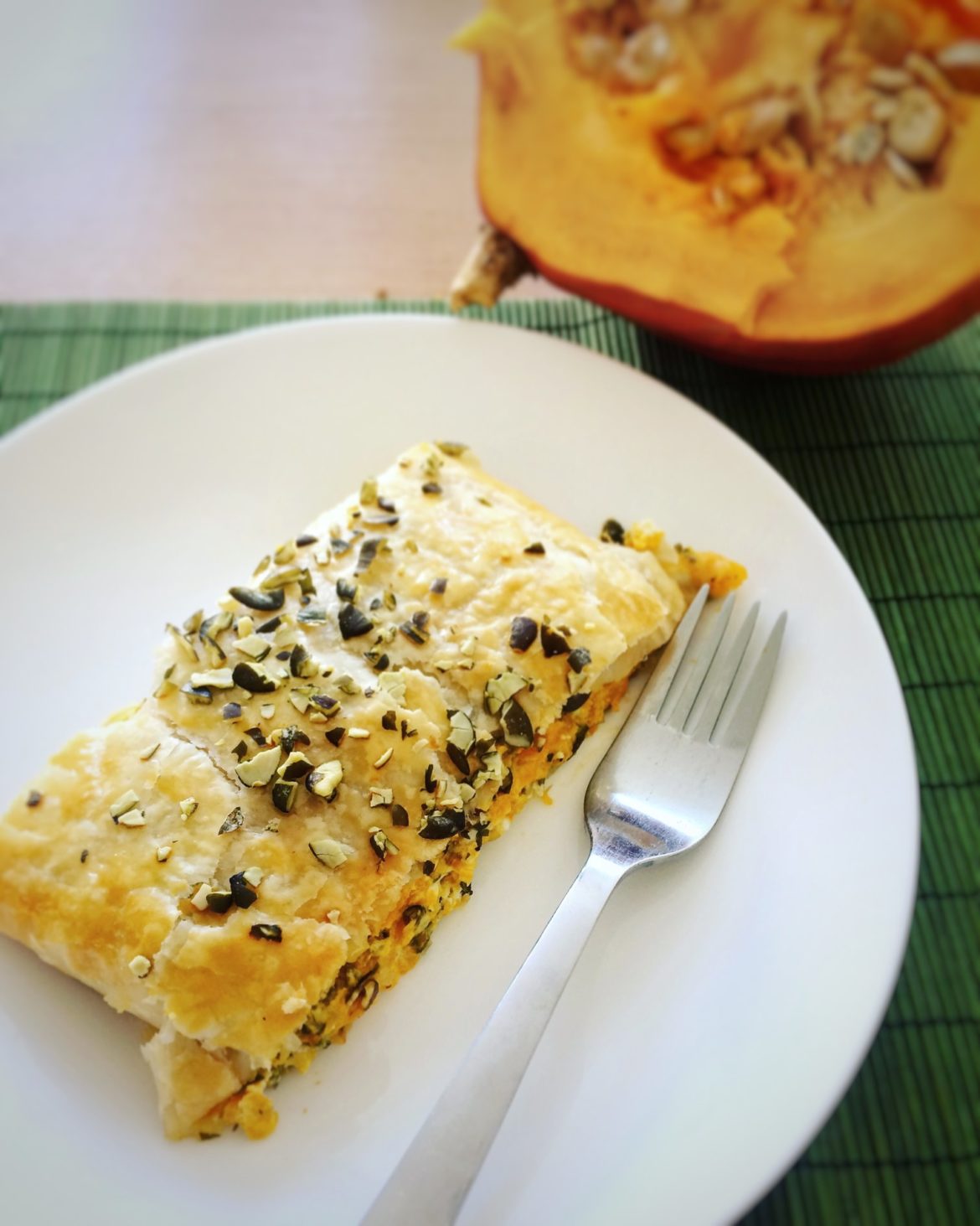 - Den Blätterteig ausrollen und auf ein mit Backpapier ausgelegtes Backblech legen. Die Füllung in die Mitte geben und zu einem Strudel einschlagen. Den Strudel mit einem verquirlten Ei bestreichen und mit gehackten Kürbiskernen bestreuen.