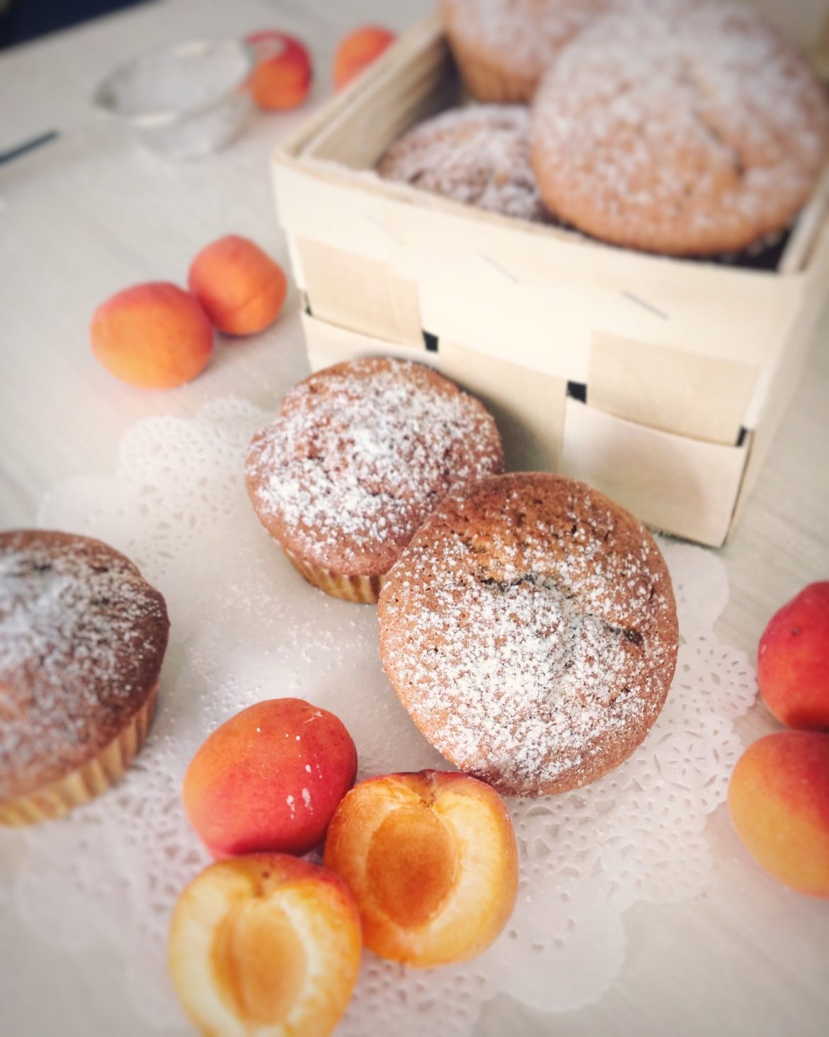 7. Die Marillen waschen und in Spalten schneiden. Auf jeden Muffin 2-3 Spalten legen.