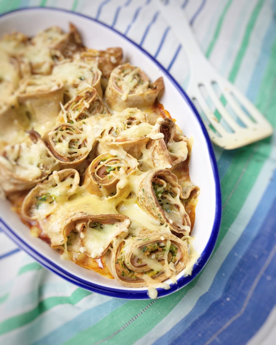 Das Kind liebt Palatschinken, deswegen gibt es sie bei uns eigentlich relativ oft. Aber sie müssen nicht immer süß sein. Wir mögen auch die herzhafte Variante. Gefüllt mit Schinken, Karotten und Zucchini und überbacken mit Käse.
