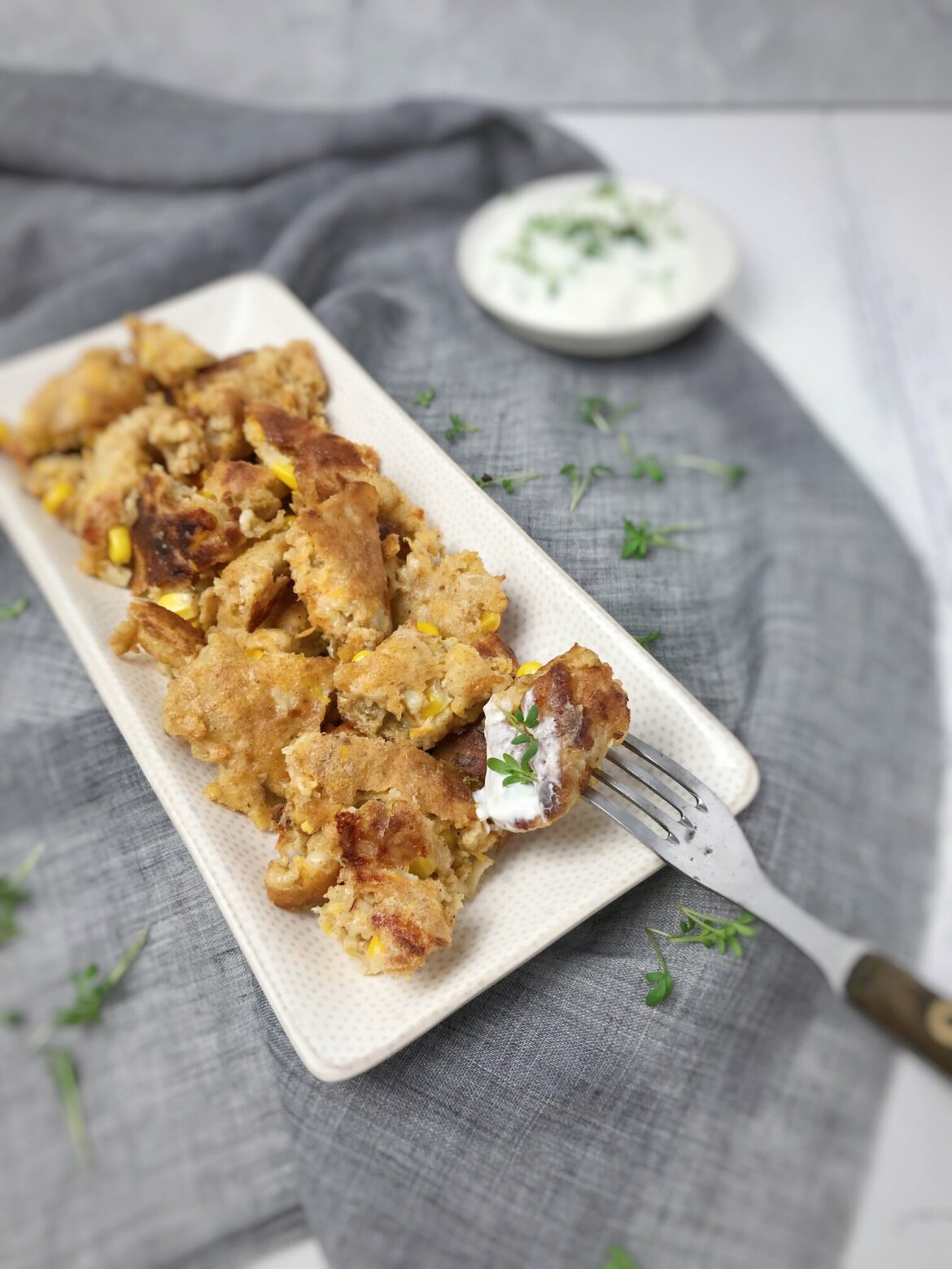 Zum Schmarrn schmeckt super ein Sauerrahmdip. Dafür Sauerrahm glattrühren und mit Salz, Pfeffer und etwas Zitronensaft würzen. Gehackte Kräuter nach Wahl dazugeben und mit dem Schmarrn genießen!