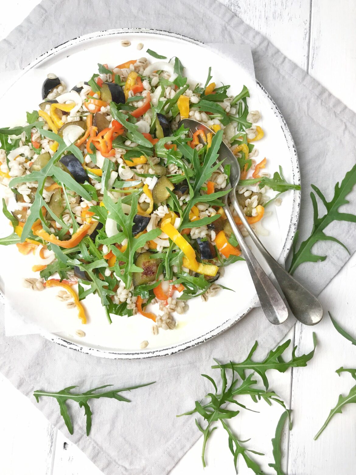 3. Wenn die Rollgerste ausgekühlt ist, das gesamte Gemüse (bis auf den Rucola) und die Zwetschken dazugeben und alles gut mischen.