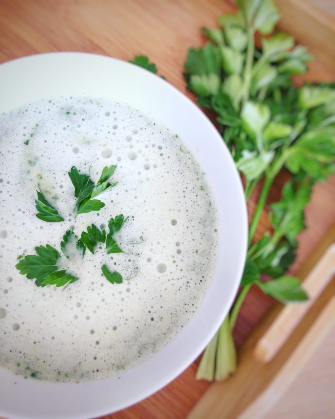 - Anschließend die gehackte Petersilie dazugeben, mit Salz, Pfeffer und Muskatnuss würzen und mit einem Pürierstab schaumig pürieren.