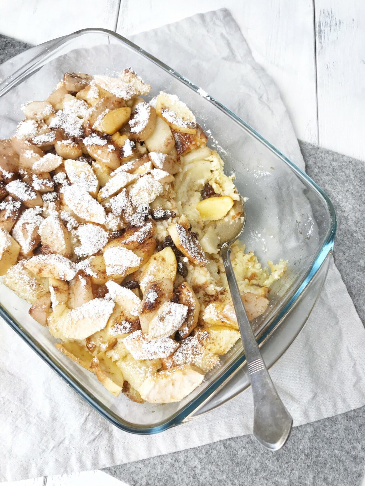- Dann zuerst die Hälfe der Striezel-Masse hineingeben. Danach die Hälfe der Äpfel und Birnen hineingeben und 2 EL Rosinen drüberstreuen. Dann wieder Striezel-Masse draufgeben und zum Schluss die zweite Hälfte der Äpfel und Birnen sowie die restlichen Rosinen hineinfüllen. Zum Schluss mit Zimt bestreuen.