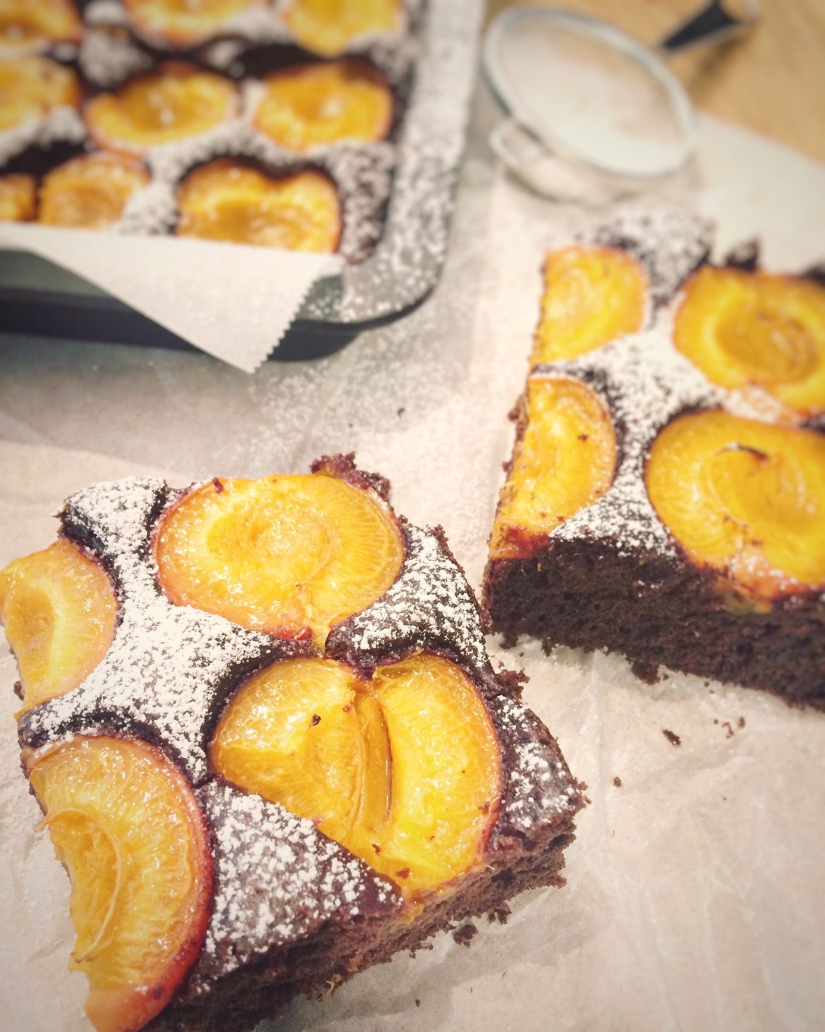 - Ein Backblech mit Backpapier auslegen und den Teig gleichmäßig darauf verteilen. Die Marillenhälften eng nebeneinander drauflegen.