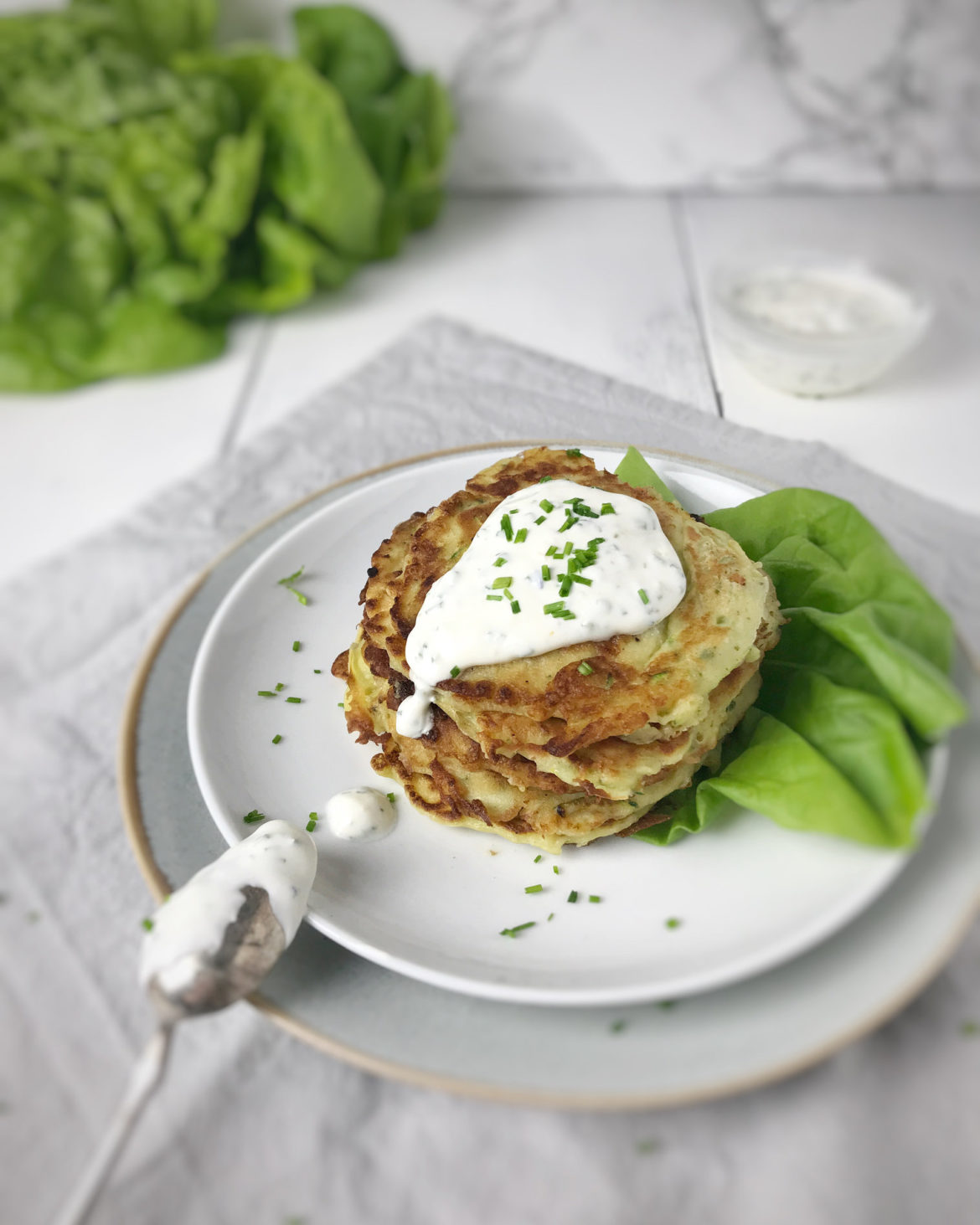 - Kräuter fein hacken und mit dem Sauerrahm und etwas Salz glattrühren. Die Pancakes damit servieren.