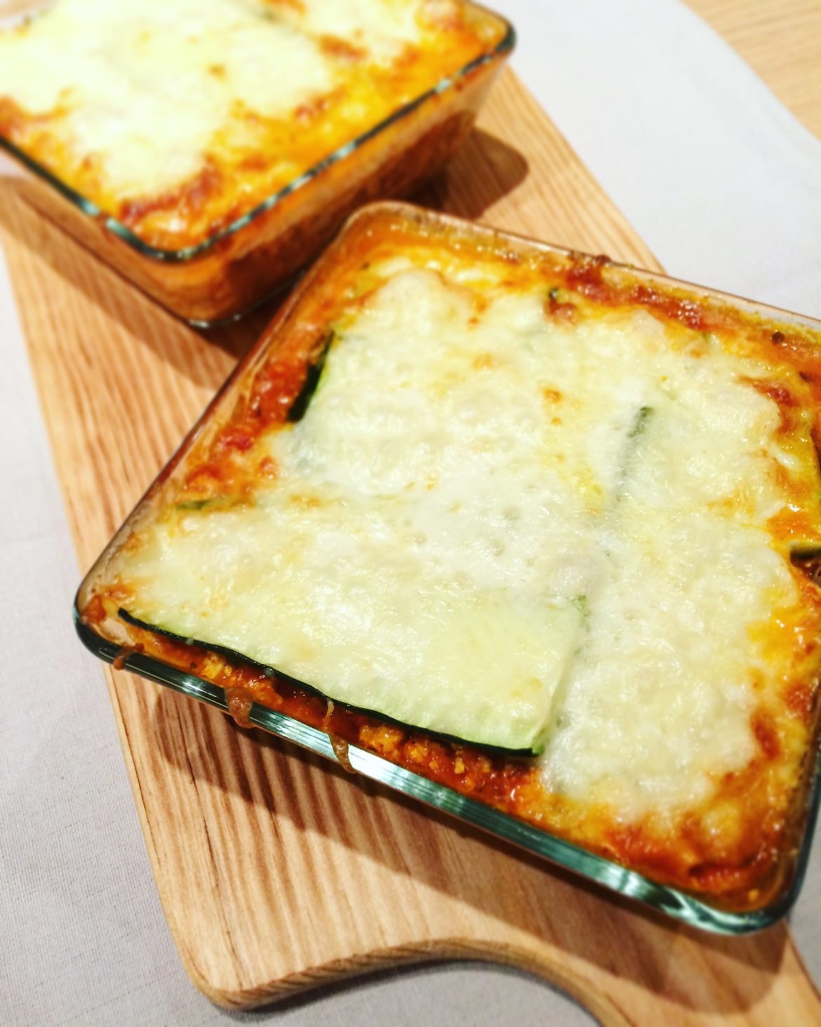 - In einer Auflaufform zuerst eine Schicht Zucchini einlegen. Anschließend die Hälfte der Tomaten-Tofu-Soße. Dann wieder Zucchini, wieder Soße und abschließend Zucchini. Die Lasagne mit dem geriebenen Mozzarella bestreuen und oben drauf noch die Mozzarella-Scheiben legen.