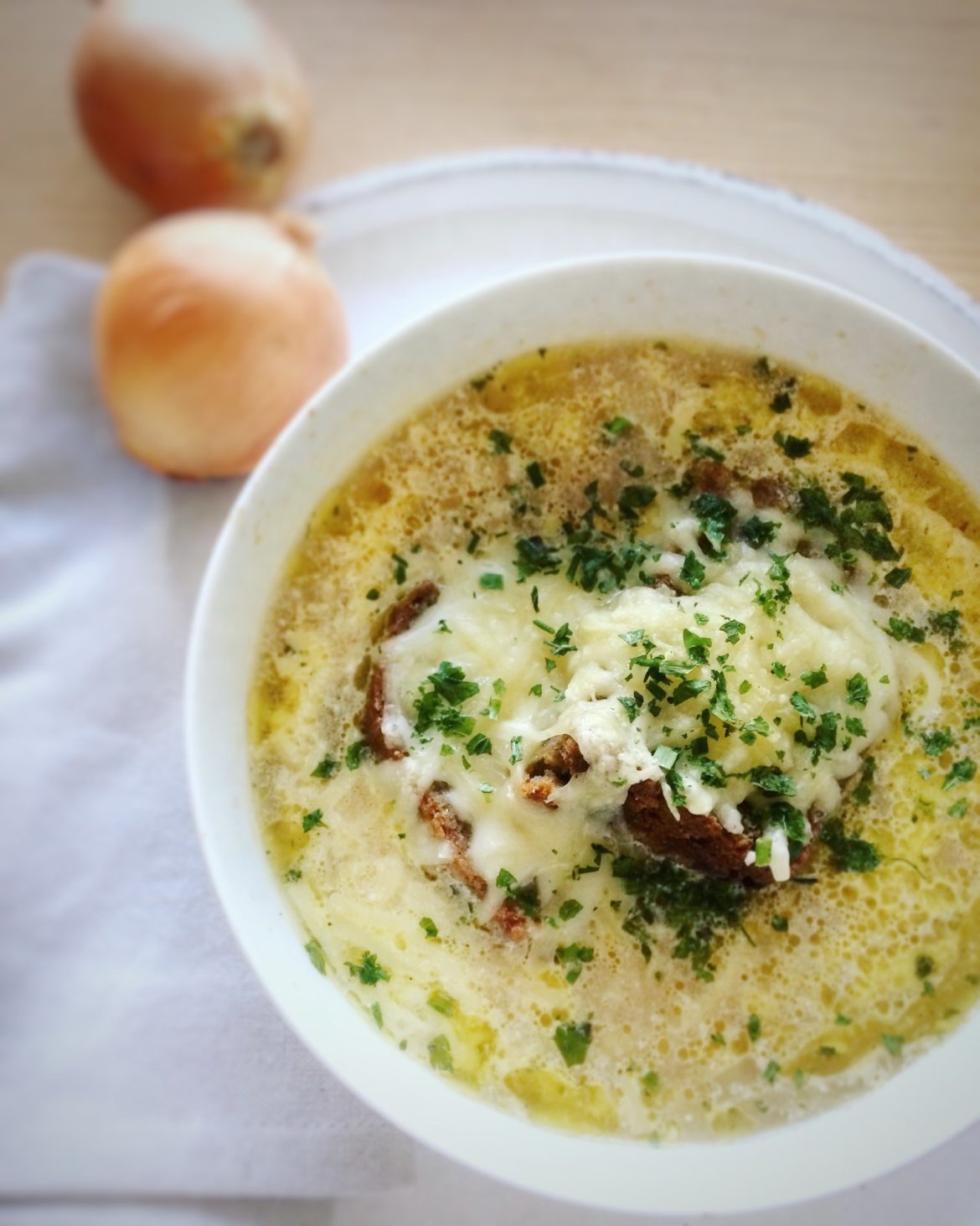 - Die Suppe in backofengeeignete Schalen geben, die halbierten Brotscheiben drauflegen und mit Käse bestreuen. Ca. 5 Minuten im Backofen überbacken.